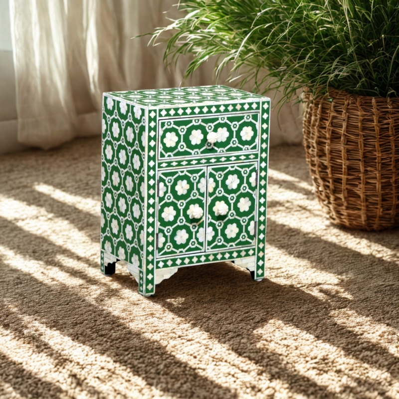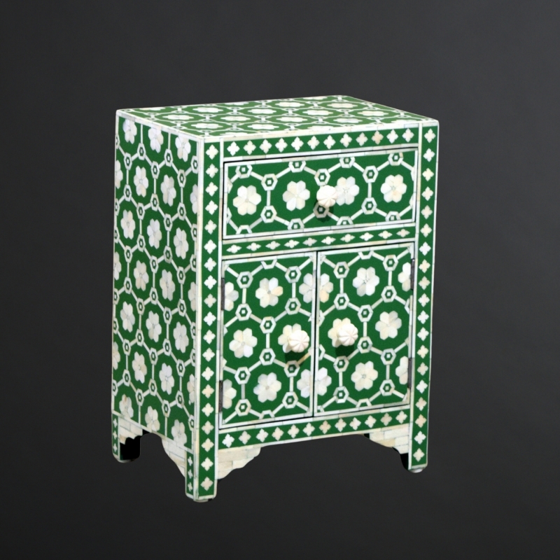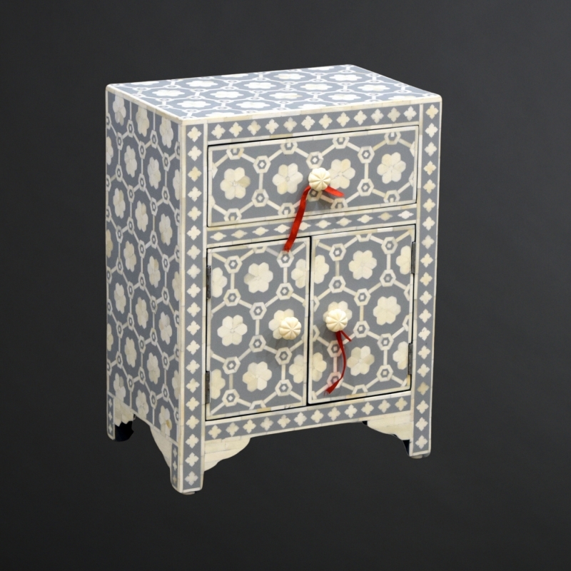 The KAP-.... bedside cabinet showcases a charming floral bone inlay pattern over a soothing grey background. With one drawer and a double-door cabinet, this compact unit adds both beauty and utility beside a bed or in any cozy corner.