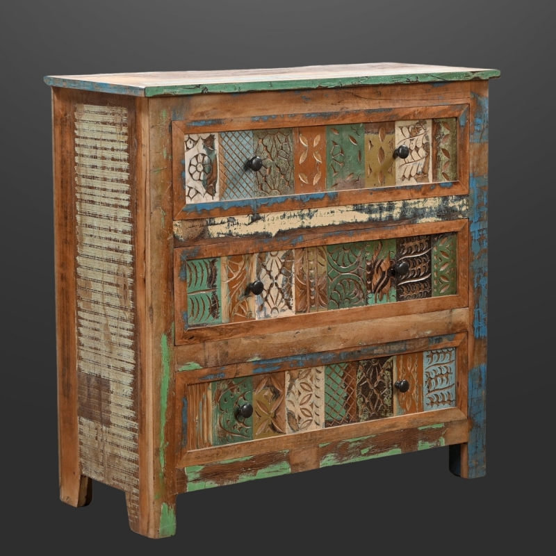 Infuse your space with artistic soul and sustainable elegance with this handcrafted 3-drawer chest made from reclaimed wood. Each piece tells a story, showcasing a rich mosaic of hand-carved panels, distressed paint layers, and natural wood textures that bring life, warmth, and heritage into any room.