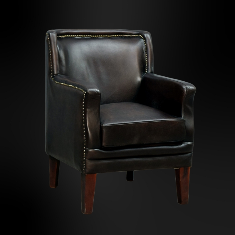 Sleek, refined, and luxuriously comfortable — the KAP-7515 is a sophisticated club chair perfect for modern interiors. Upholstered in rich dark chocolate goat leather, this piece features a minimalist silhouette with gently curved arms and bold brass stud accents.