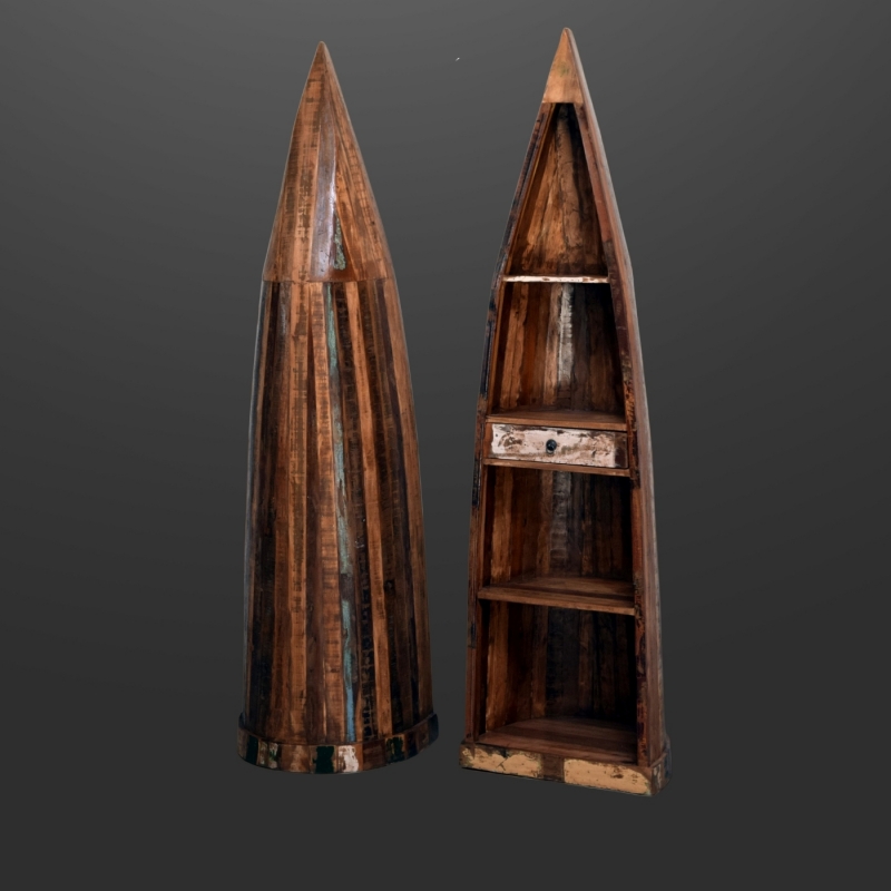 Add a splash of rustic coastal charm to your home with this unique boat-shaped cabinet, handcrafted from reclaimed wood. This distinctive piece functions as both a bookshelf and a statement decor item.